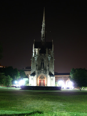 The side door had a sign that said that the church (or Heinz Memorial Chapel, as it said on the sign (http://www.heinzchapel.pitt.edu/) ) closed at 5PM, so I was pretty sure it was closed. I went around the building, admiring all its niceties, and then I reached the front door. Just for kicks, I tried pushing it to see if it opened. It did. Uncertain about whether I was allowed to go inside, I let it close and slowly walked away. It wasn't 10 seconds before a talkative man with a moustache came out of the front door, invited me inside, and offered to tour me around. He turned the lights and WOW! it was the most beautiful church I remembered ever seeing. I don't too much about church decorations, so I can't describe it too well, but the columns, all made of stone in classical style, looked gray-smooth and perfect. The windows were narrow but gigantically tall, and there was also an organ. He started to show me how he could push and pull knobs out of the organ to make certain pipes active, and so, to change the sound ever so slightly to create different effects. I think he was just showing off when he played the Toccata y Fugue with all the organ pipes turned on, but when we were exiting the chapel, a lot of students were standing in the front, saying they were walking around the church and had gotten scared when the dark, empty-looking church began to emit a classic scary, dracula-like tune at full volume. The man also invited THEM into the church, and gave them the whole tour again. I stayed with them and learned that the organ had 4,272 pipes all hidden inside the chapel, and heard him play a couple more songs on the organ. Unfortunately, I had not bought any batteries for my camera at that time, so I did not take any pictures of the chapel's insides. I hope to still have a chance to capture some inside chapel images in the morning (if I wake up early enough).